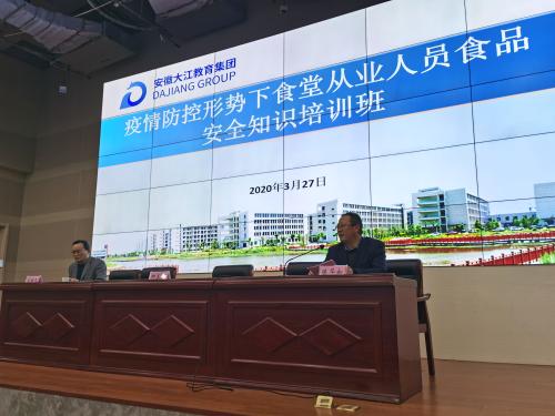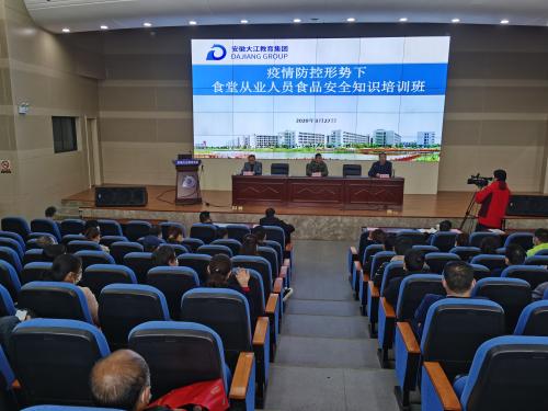 为认真贯彻落实国务院《关于切实加强疫情科学防控有序做好企业复工复产工作的通知》和省政府《关于2020年春季学期全省学生返校安排的通告》精神,我市各级各类学校将于近期有序开学。开学后师生就餐如何安排、就餐环节疫情如何防控、食品安全如何保障,3月27日下午,安徽大江教育集团针对集团旗下安工学院、市示范性综合实践基地和市中职中心食堂所有管理和从业人员,专门组织了一次疫情防控形势下食堂从业人员食品安全知识培训,提前安排部署新冠肺炎疫情防控期间学校食堂食品安全管理工作。培训活动由集团董事陈华如同志全程主持,安工学院分管副院长曹芳胜和有关院校总务部门负责人、各餐饮单位工作人员100余人参加了培训。